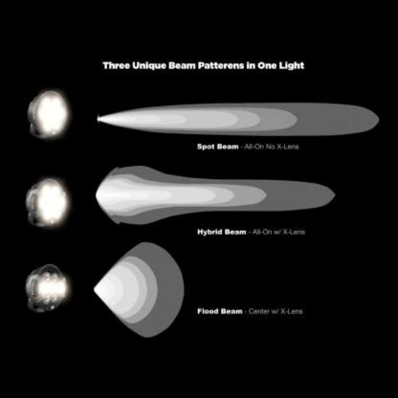 - Dual-Beam-Technologie – Unabhängige Steuerung (und Dimmen) des mittleren Flutlichtstrahls, des äußeren Punktstrahls oder des All-On-Hybridstrahls