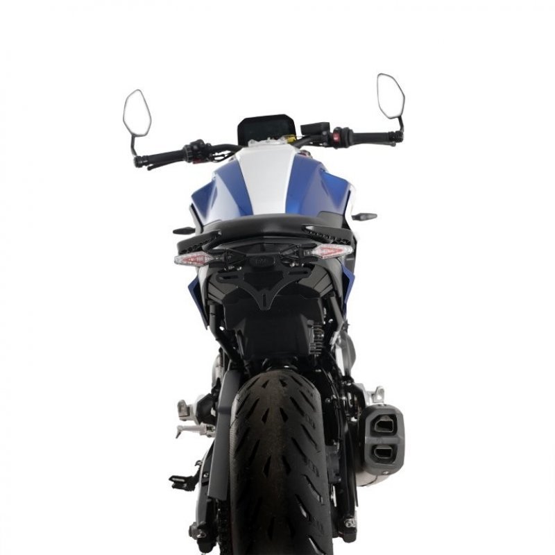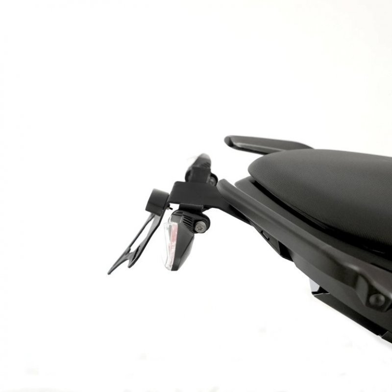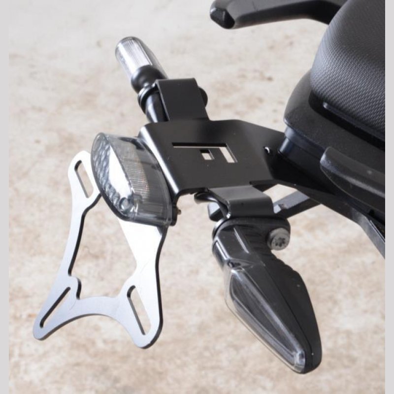 Im Lieferumfang befindet sich eine LED Beleuchtung mit E-Zeichen. Die LED Beleuchtung ist als Ersatz für das original Rücklicht und hat 3 Funktionen integriert: (Rücklicht, Bremslicht und Kennzeichenbeleuchtung). Der Kennzeichenhalter kann sowohl mit Original Blinkern und auch mit unseren R&G Microblinkern gefahren werden.